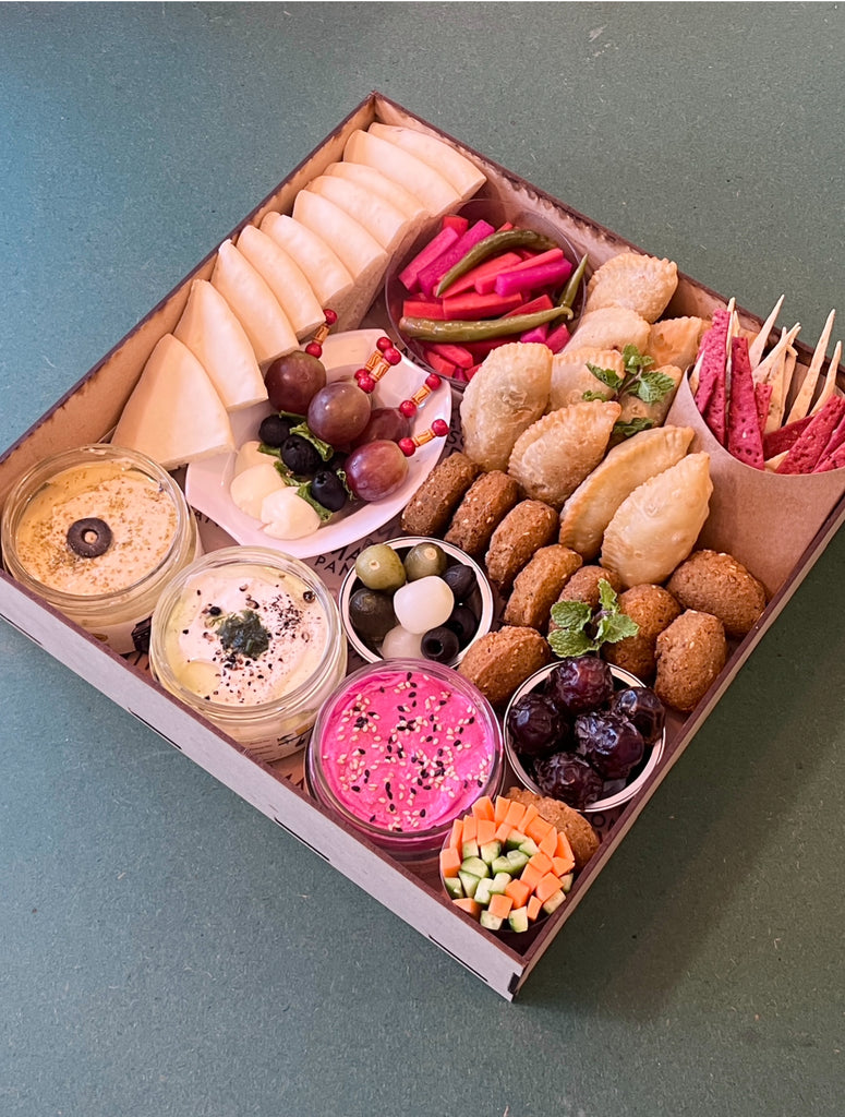 The Marhaba box is the perfect blend of spices, flavour, and aromas. Spread that hummus on your pita pockets, stuff it with falafel and top it with olives, gherkins and pickled onions. Don't forget to dip the lavash with our homemade tzatziki and the delicious cheese sambousek in the freshly made beetroot labneh! 100% vegetarian. This is the perfect special occasions box you're looking