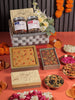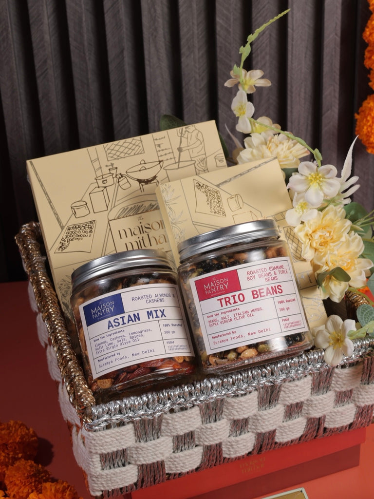 A thoughtful gift for the health-conscious – this golden & silver keepsake basket is filled with roasted savoury treats,our signature desi ghee besan slab and anjeer, date and almond slab. Packed with flavour, not guilt.