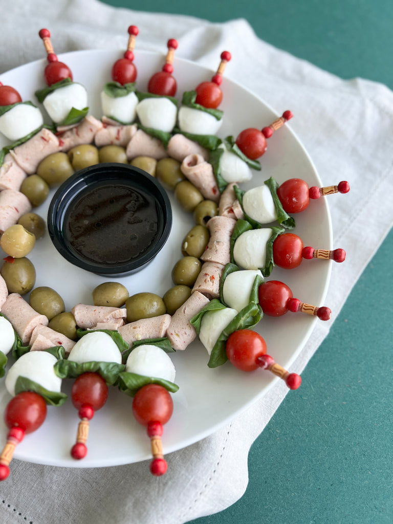 Cherry mozzarella skewered with fresh cherry tomatoes, chicken salami, olives and basil leaves on a stick. Top it with balsamic dressing or serve as it is.