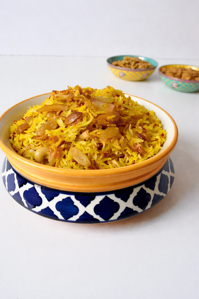 Celebrate Baisakhi with our special yellow coloured meethe chawal. They have the traditional flavours of saffron and cardamom and have lots of nutty dry fruits like almonds, raisins, cashews and coconut. The beautiful ceramic bowl makes it ideal to be carried as a gift for your celebrations.