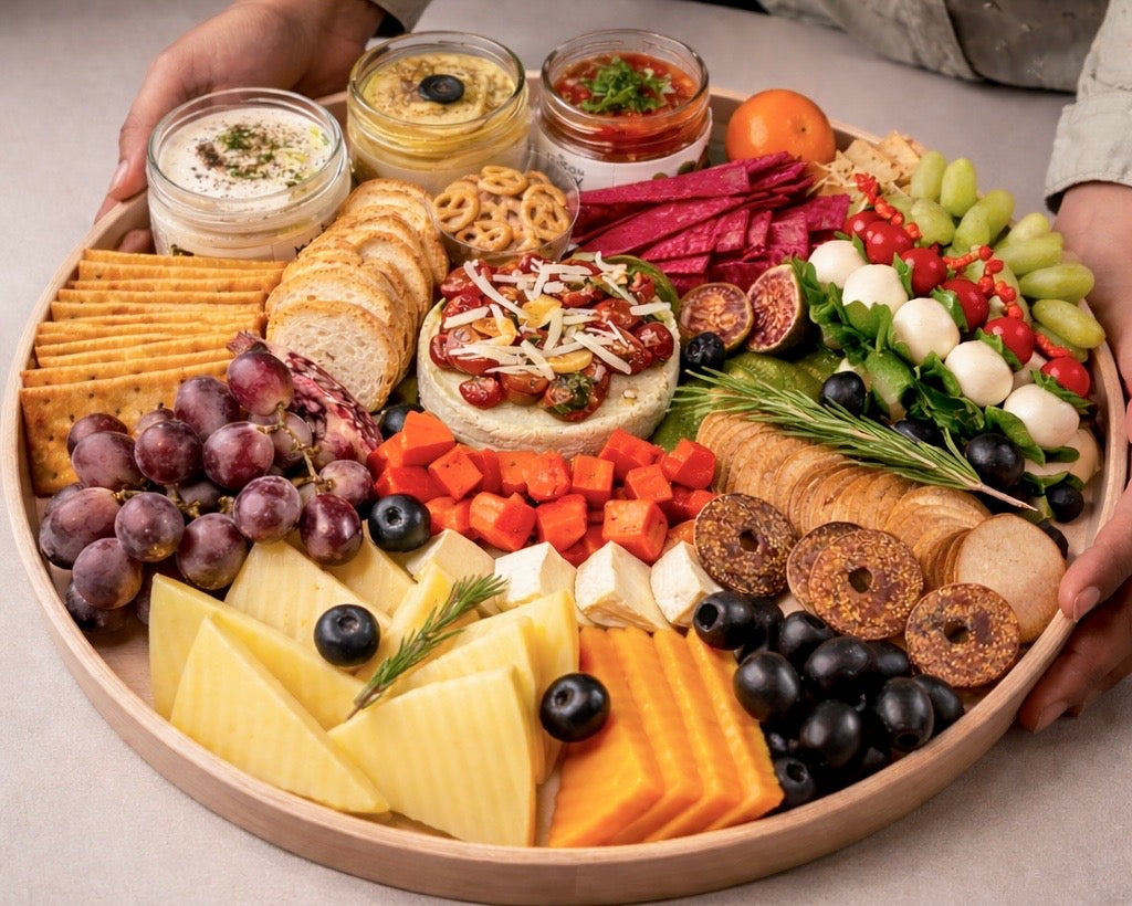 Our newsest introduction on the menu- A jumbo wooden tray fiilled with an assortment of cheese, crackers, dips, cream cheese and seasonal fruits. This tray is ideal to be the centre piece at your party!